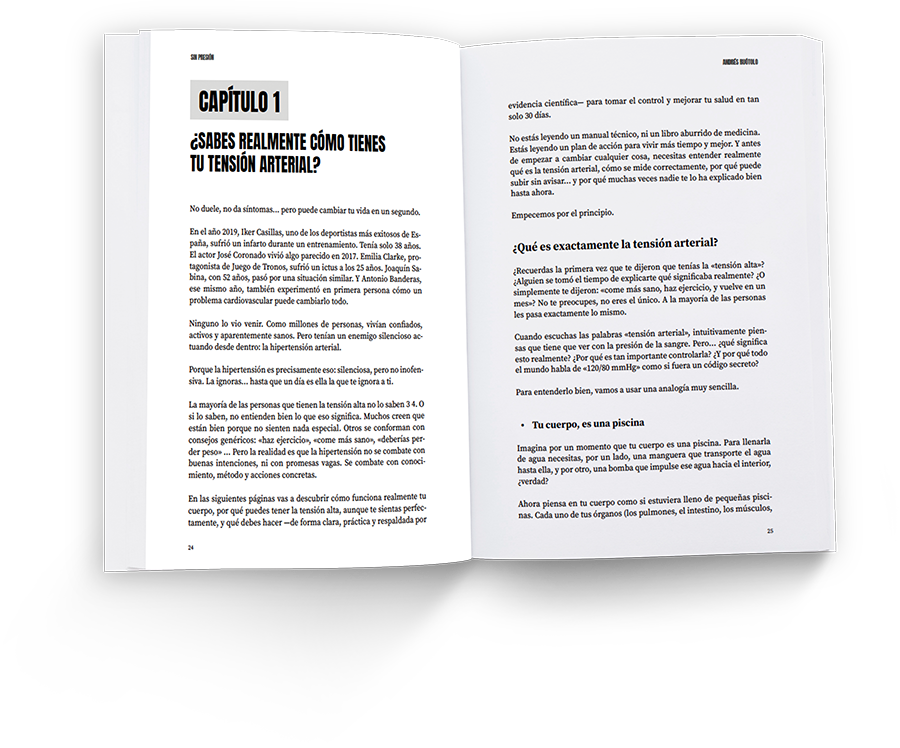 La hipertensión no tiene por qué condicionar tu vida. En este libro encontrarás pautas claras, realistas y científicamente validadas para reducir tu tensión arterial y ganar en salud y tranquilidad.”